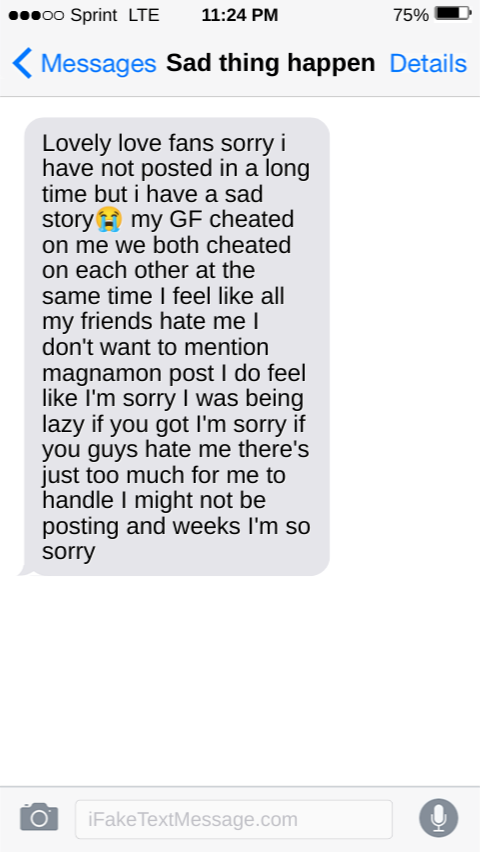 Lovely love fans sorry i have not posted in a long time but i have a sad story😠my GF cheated on me we both cheated on each other at the same time I feel like all my friends hate me I don't want to mention magnamon post I do feel like I'm sorry I was being lazy if you got I'm sorry if you guys hate me there's just too much for me to handle I might not be posting and weeks I'm so sorry