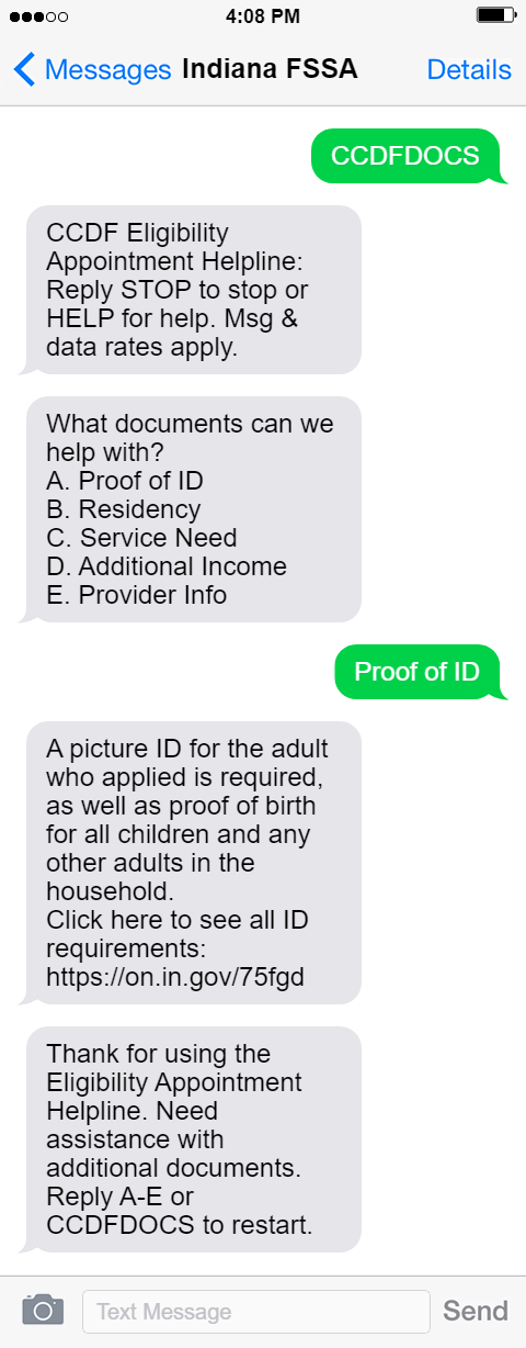 Thank for using the Eligibility Appointment Helpline. Need a**istance with additional documents. Reply A-E or CCDFDOCS to restart.