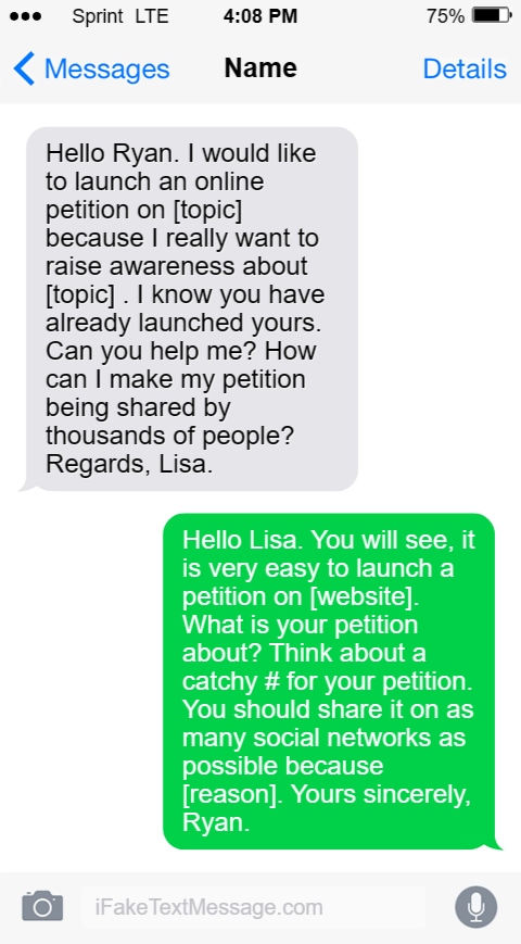 hello Lisa. You will see, it is very easy to launch a pet**ion on [website]. What is your pet**ion about? Think about a catchy # for your pet**ion. You should share it on as many social networks as possible because [reason]. Yours sincerely, Ryan.