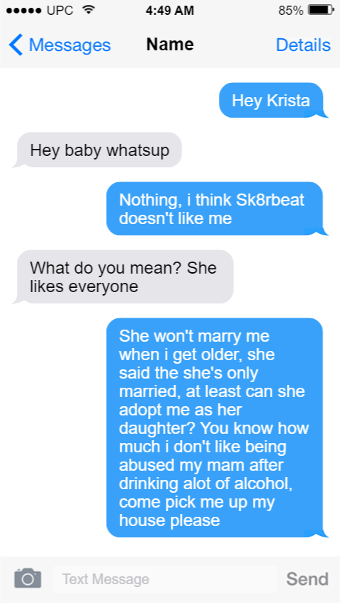 She won't marry me when i get older, she said the she's only married, at least can she adopt me as her daughter? You know how much i don't like being abused my mam after drinking alot of a******, come pick me up my house please