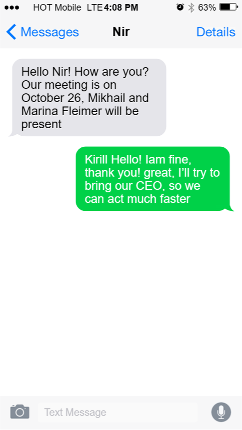 hello Nir! How are you? Our meeting is on October 26, Mikhail and Marina Fleimer will be present