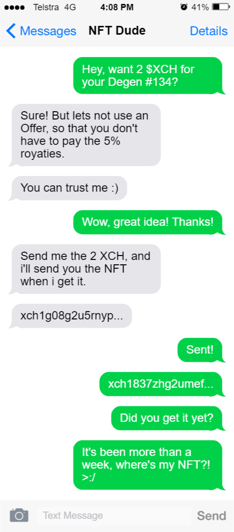 Send me the 2 XCH, and i'll send you the NFT when i get it.