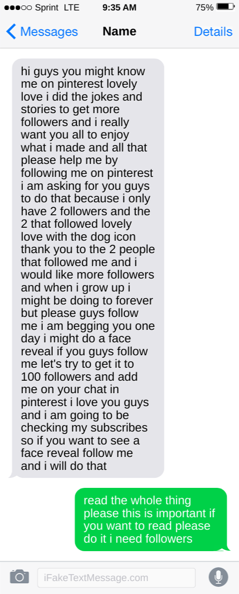 hi guys you might know me on pinterest lovely love i did the jokes and stories to get more followers and i really want you all to enjoy what i made and all that please help me by following me on pinterest i am asking for you guys to do that because i only have 2 followers and the 2 that followed lovely love with the dog icon thank you to the 2 people that followed me and i would like more followers and when i grow up i might be doing to forever but please guys follow me i am begging you one day i might do a face reveal if you guys follow me let's try to get it to 100 followers and add me on your chat in pinterest i love you guys and i am going to be checking my subscribes so if you want to see a face reveal follow me and i will do that
