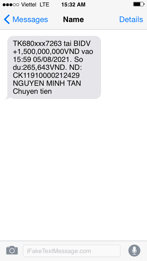 TK680xxx7263 tai BIDV +1,500,000,000VND vao 15:59 05/08/2021. So du:265,643VND. ND: CK11910000212429 NGUYEN MINH TAN Chuyen tien