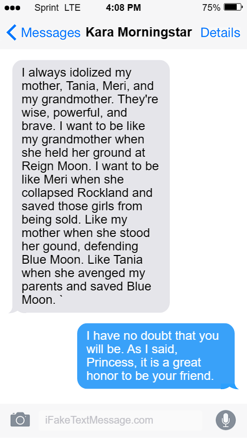 I always idolized my mother, Tania, Meri, and my grandmother. They're wise, powerful, and brave. I want to be like my grandmother when she held her ground at Reign Moon. I want to be like Meri when she collapsed Rockland and saved those girls from being sold. Like my mother when she stood her gound, defending Blue Moon. Like Tania when she avenged my parents and saved Blue Moon. `