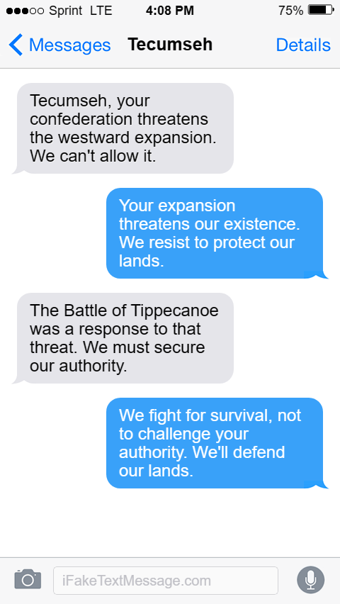 Tecumseh, your confederation threatens the westward expansion. We can't allow it.