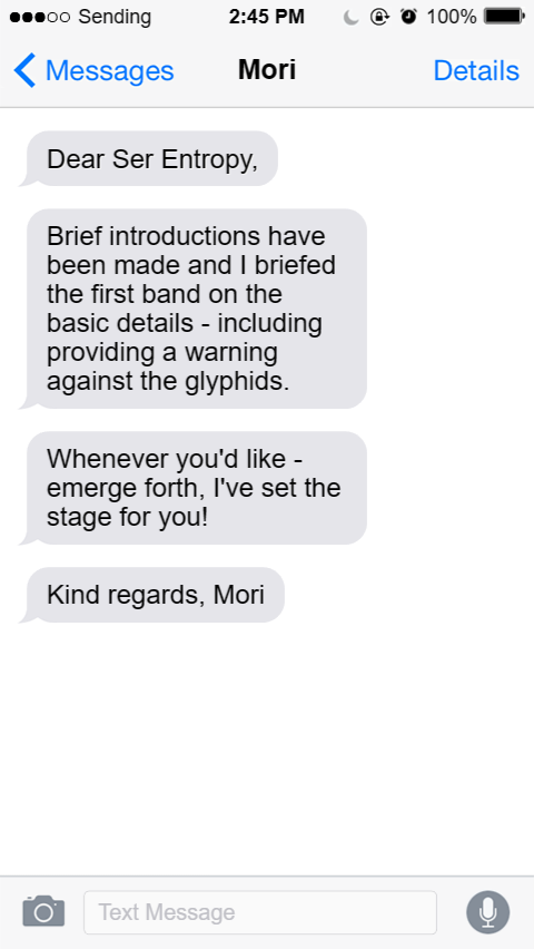 Brief introductions have been made and I briefed the first band on the basic details - including providing a warning against the glyphids.