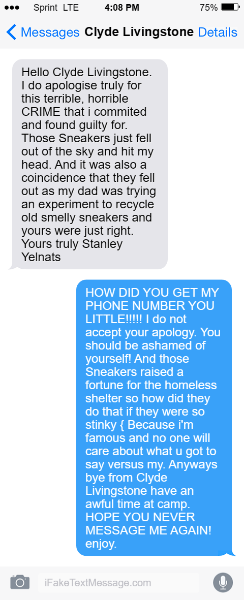 HOW DID YOU GET MY PHONE NUMBER YOU LITTLE!!!!! I do not accept your apology. You should be ashamed of yourself! And those Sneakers raised a fortune for the homeless shelter so how did they do that if they were so stinky { Because i'm famous and no one will care about what u got to say versus my. Anyways bye from Clyde Livingstone have an awful time at camp. HOPE YOU NEVER MESSAGE ME AGAIN! enjoy.