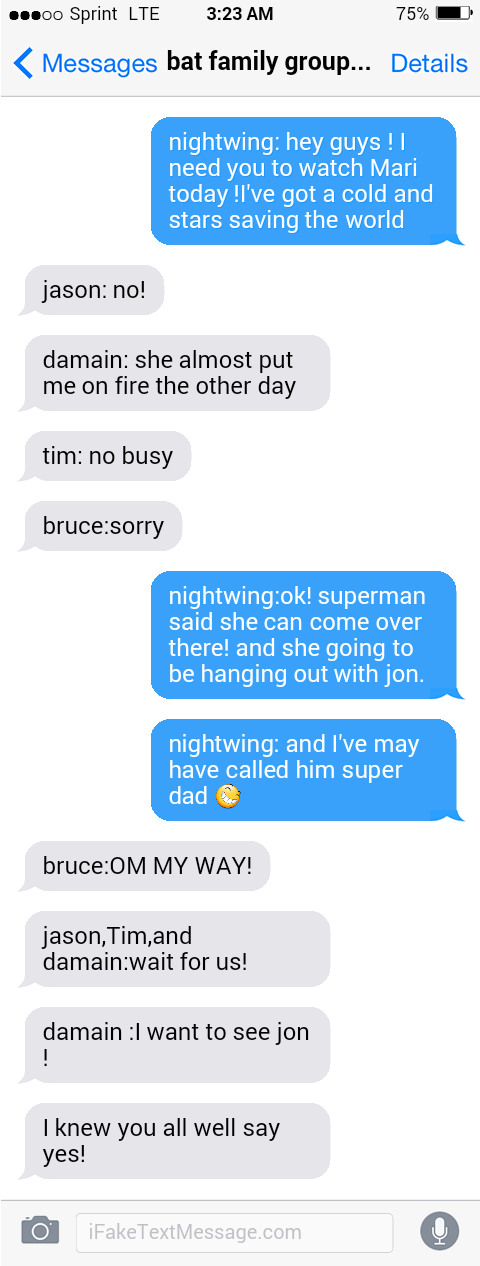 nightwing: hey guys ! I need you to watch Mari today !I've got a cold and stars saving the world