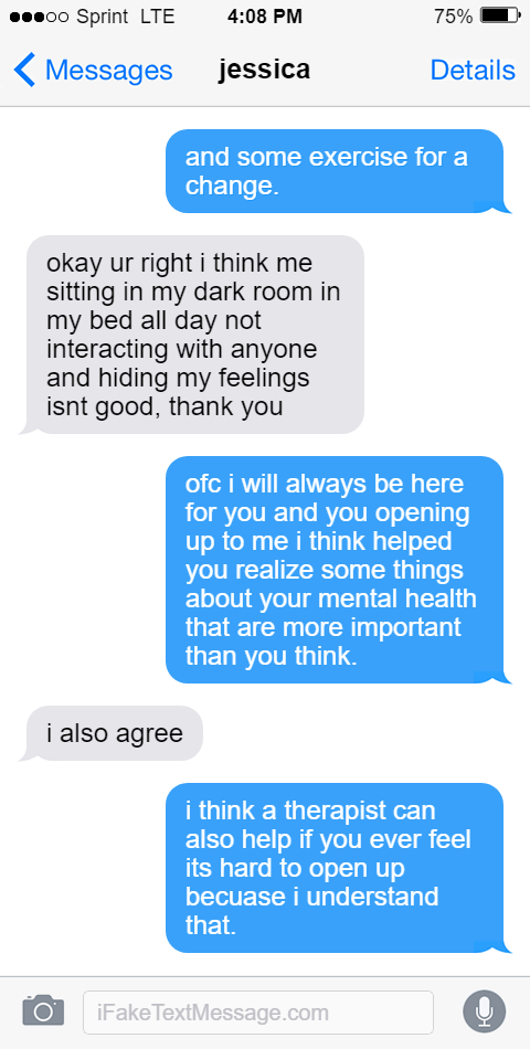 ofc i will always be here for you and you opening up to me i think helped you realize some things about your mental health that are more important than you think.