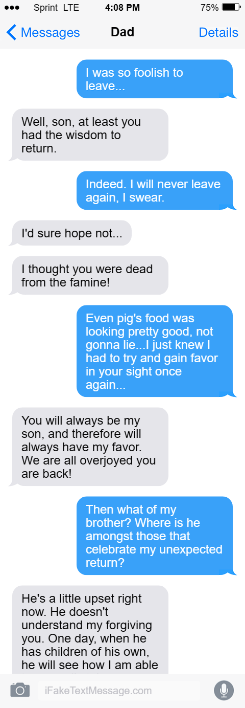 You will always be my son, and therefore will always have my favor. We are all overjoyed you are back!