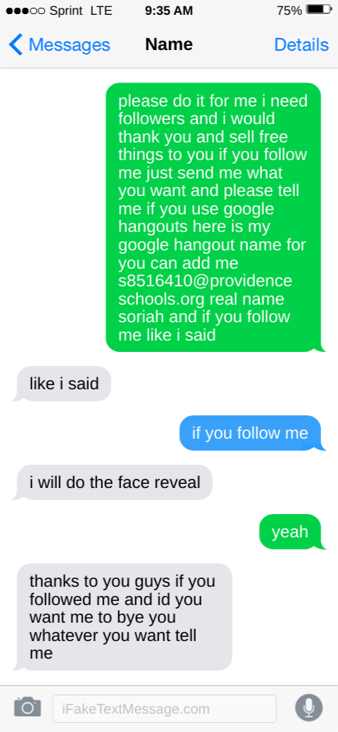 please do it for me i need followers and i would thank you and sell free things to you if you follow me just send me what you want and please tell me if you use google hangouts here is my google hangout name for you can add me s8516410@providence schools.org real name soriah and if you follow me like i said