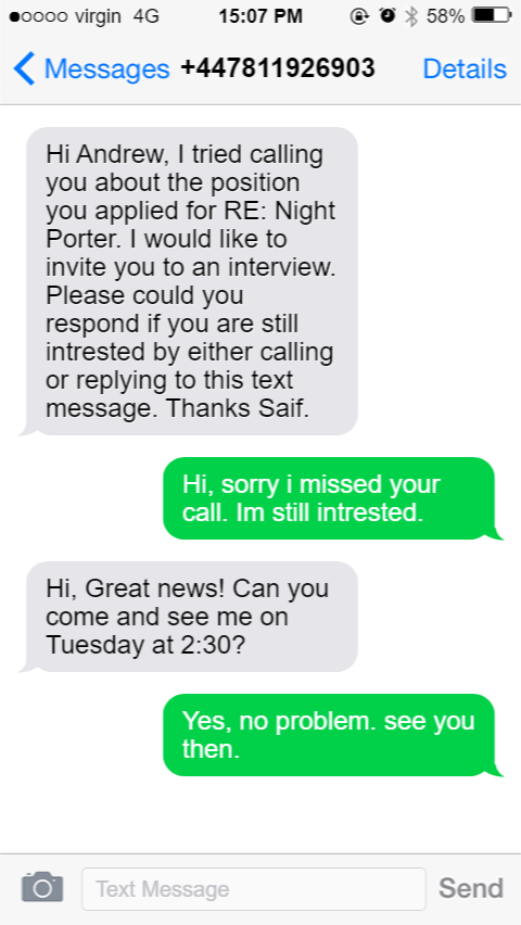 Hi Andrew, I tried calling you about the position you applied for RE: Night Porter. I would like to invite you to an interview. Please could you respond if you are still intrested by either calling or replying to this text message. Thanks Saif.