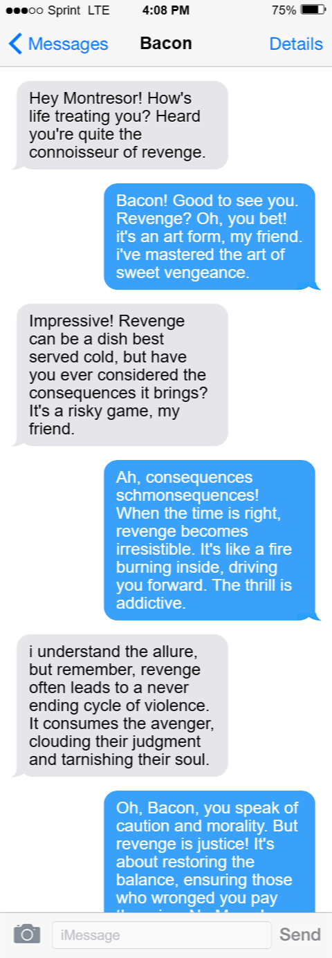 Oh, Bacon, you speak of caution and morality. But revenge is justice! It's about restoring the balance, ensuring those who wronged you pay the price. No Mercy!