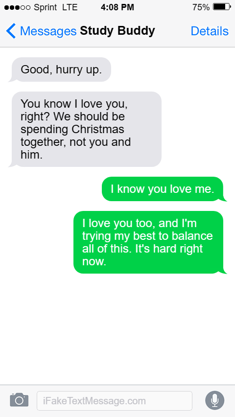 You know I love you, right? We should be spending Christmas together, not you and him.